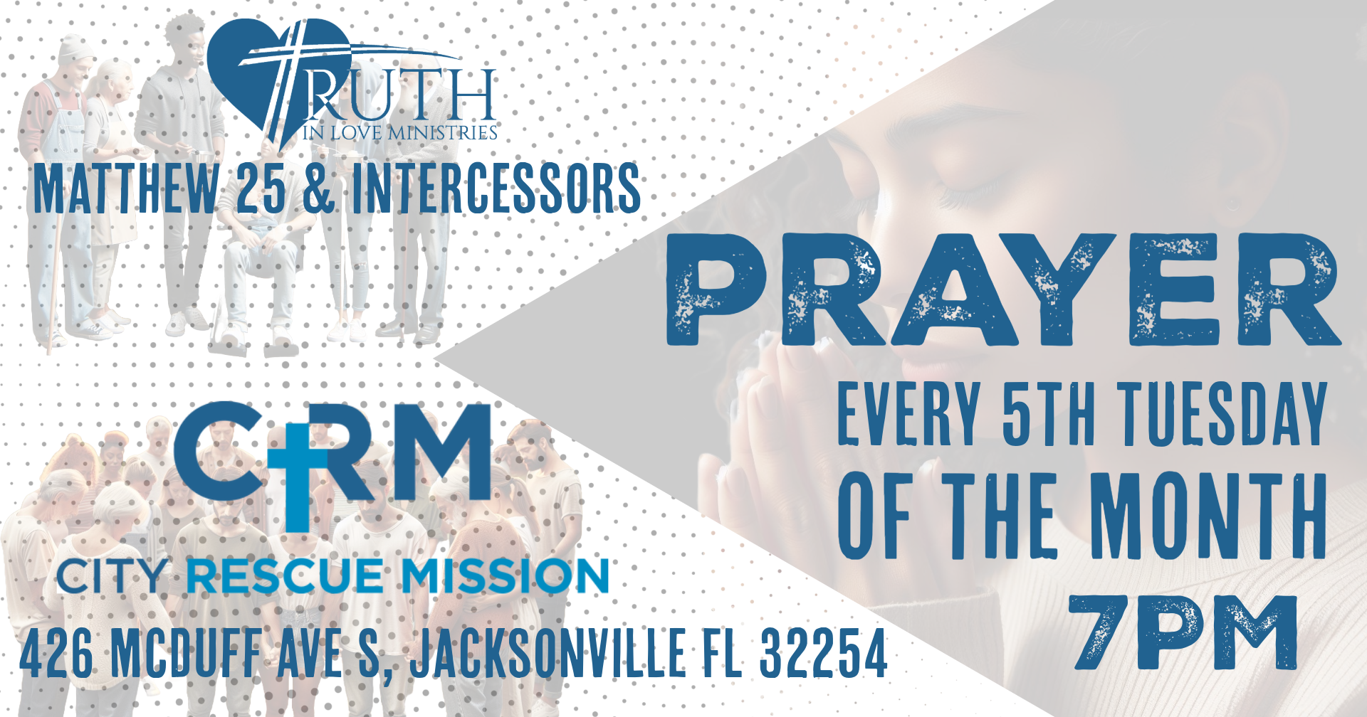 Join us in prayer, every fifth Tuesday of the month at 7PM. As we continue to connect our church to the community at the City Rescue Mission and its residents in prayer.